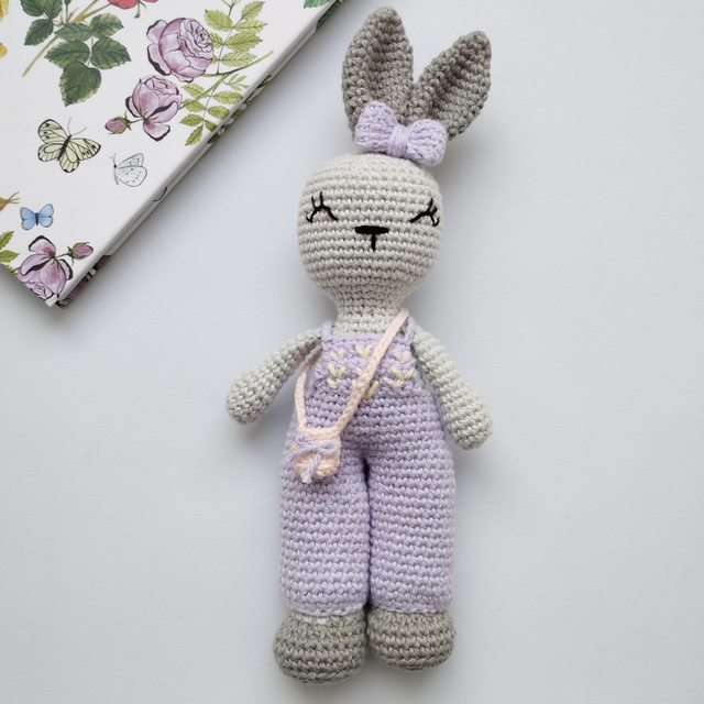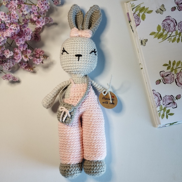 A Coelhinha Nina, em amigurumi, é feita à mão com muito amor e atenção ao detalhe, tornando-se uma peça única e especial.