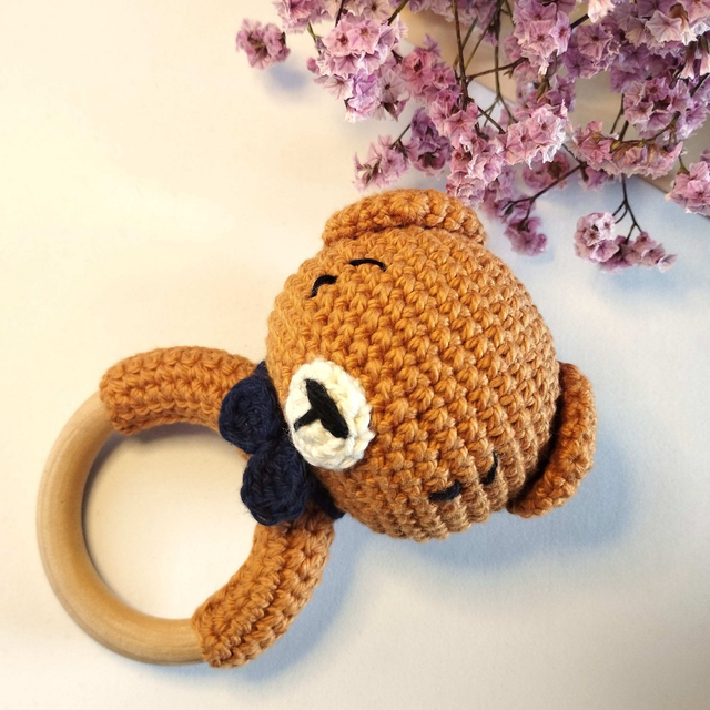 Cada um é cuidadosamente feito à mão, em croché, com fios suaves e argolas de madeira natural não tratada, perfeitas para bebés na fase de dentição. Além disso, pelas suas texturas, também são peças sensoriais, ajudando o bebé a explorar novas sensações e a desenvolver o tato.
